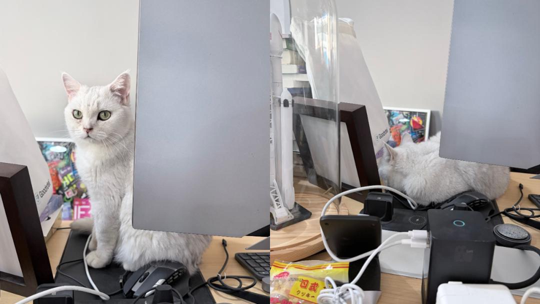 在视频的前半部分,呈现基本上自然。但是在小猫咪跳到电脑后面的时候,似乎变了另一只小猫出来,整个视频突然添了几分「魔法感」。并且,在视频的最后几秒,似乎有个开灯设定,将画面调整更亮。