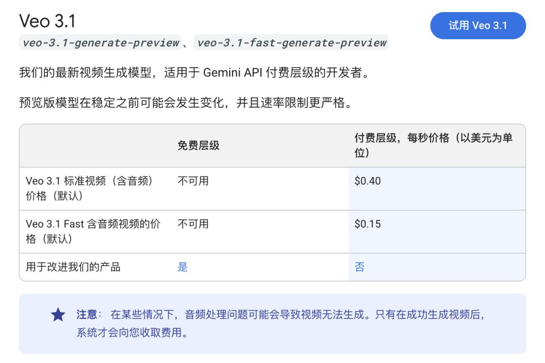 而在价格表下,谷歌也为自己留出了一条后路,提到「在某些情况下,音频处理问题可能会导致视频无法生成。只有在成功生成视频后,系统才会向您收取费用。」这也能够说明一定程度上,该视频模型仍处于不稳定的状态中。