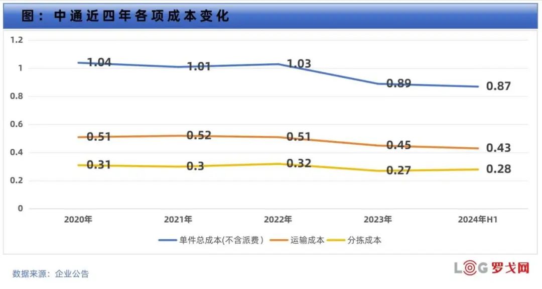 拿中通快递来讲,2024年上半年的业务量为156.23亿件,同比增长11.8%;但单票营业成本降至0.87元(不含派费),较2023年同期下降了0.02元。具体来看,单票运输成本为0.43元,同比下降0.02元,成本下降主要得益于数字化路线规划的优化提升。