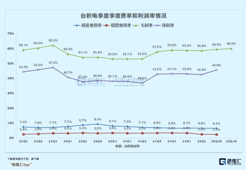 59.5%的毛利率同比升1.7个百分点、环比升0.9个百分点,超预期的58.9%。核心支撑有两点:一是3纳米(N3)、5纳米(N5)制程出货激增,库存周转天数减少2天至74天,产能利用率维持高位;二是内部成本管控见效,对冲了海外工厂成本与汇率波动影响。