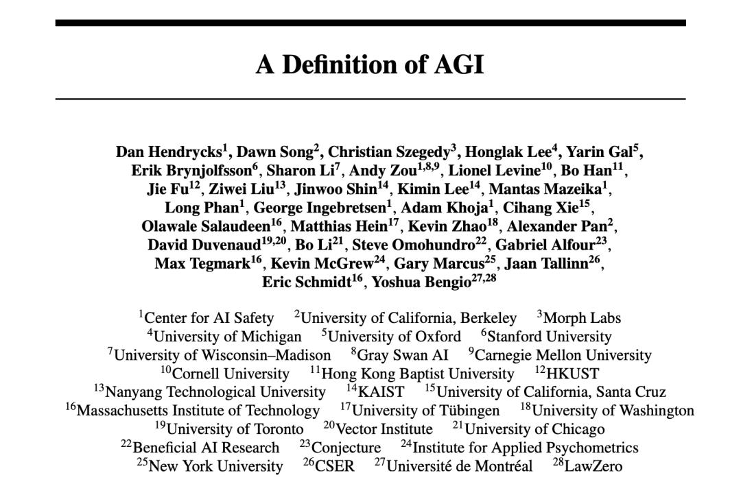 为了解决这一问题,10月16日,AI三巨头之一,图灵奖得主约书亚·本吉奥领衔的豪华国际研究团队发表了一篇重要论文《A Definition of AGI》(AGI的定义),试图为这个模糊的概念做迄今为止最清晰的定义。