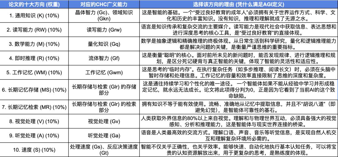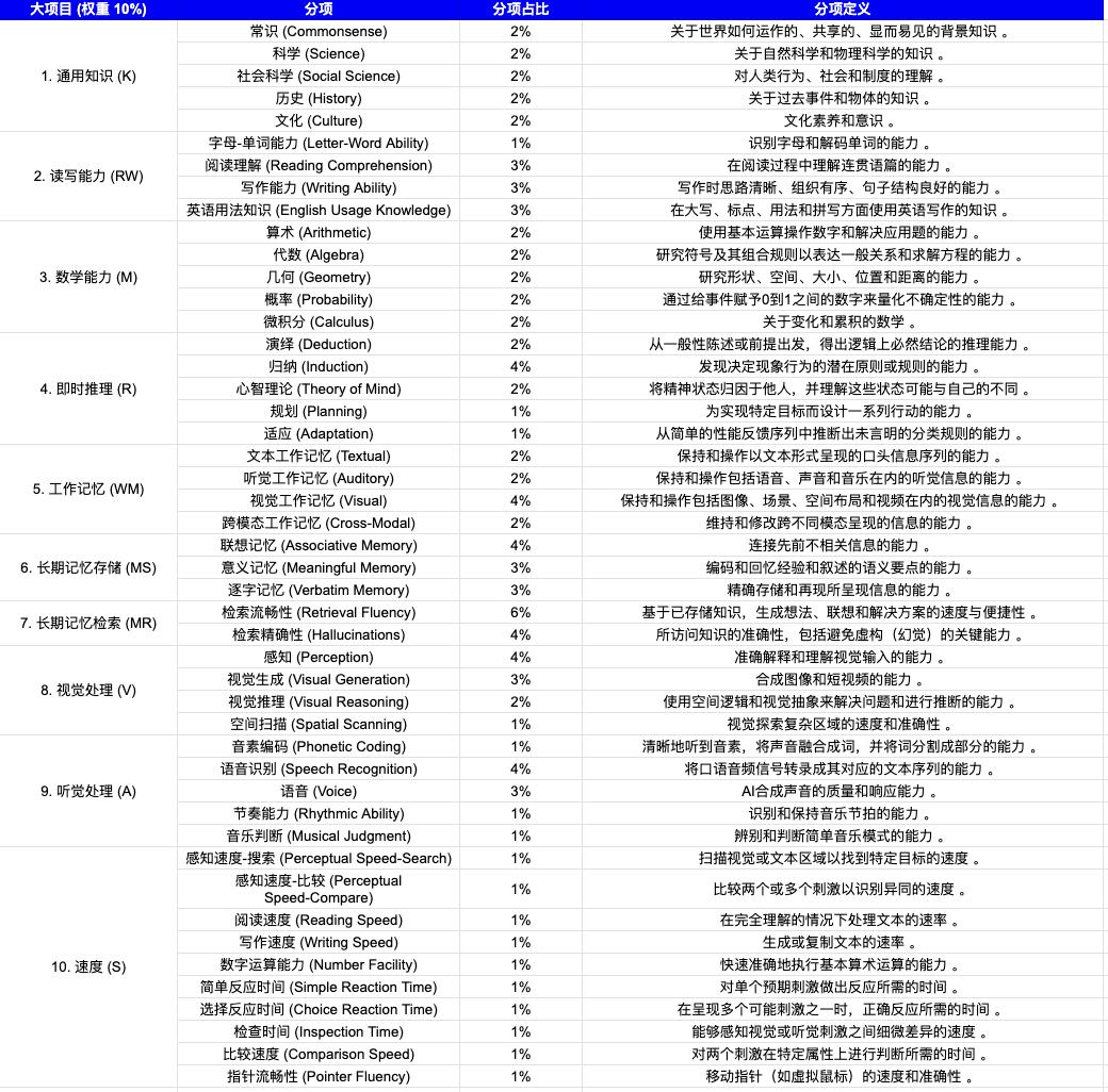 这篇重新定义AGI论文基本上是对这一金字塔结构的改编和操作化。按照CHC的十大广义能力,AGI的能力也被分为十大方向,每个方向平均的占有AGI满分评分中的10分: