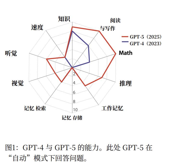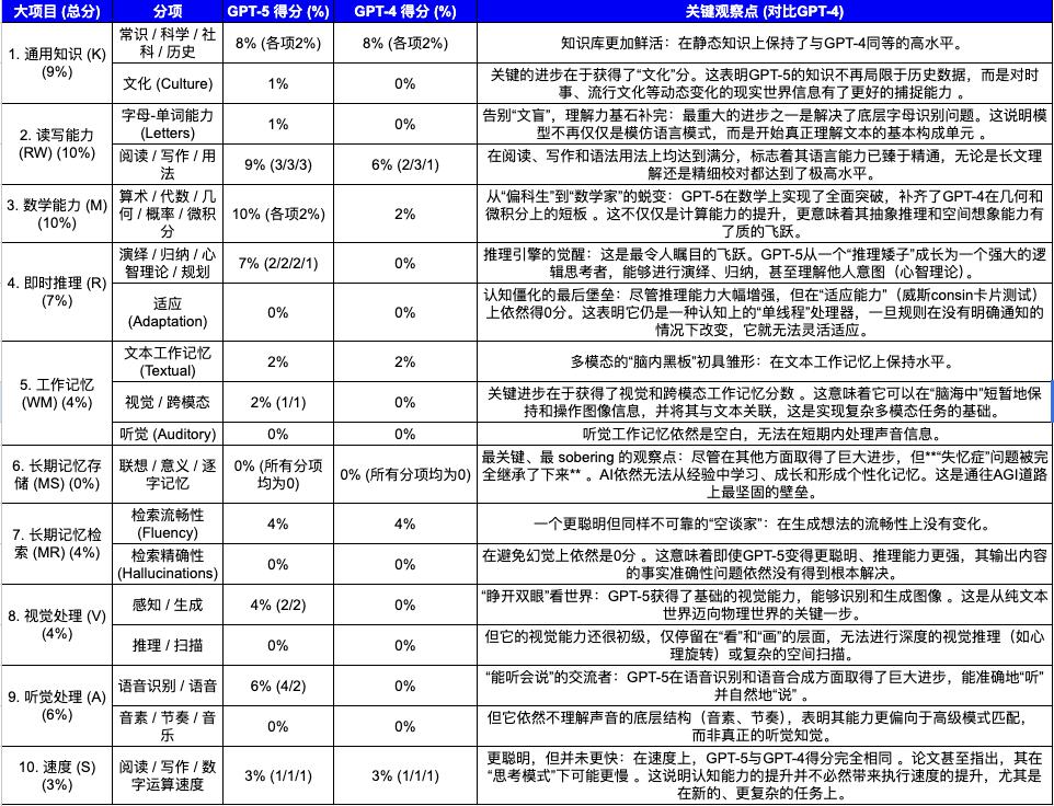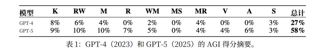 根据论文的评估,GPT-4的AGI总分为27%,而于2025年问世的GPT-5的总分可达58%。总分虽然翻倍,但进步却非常不平均。