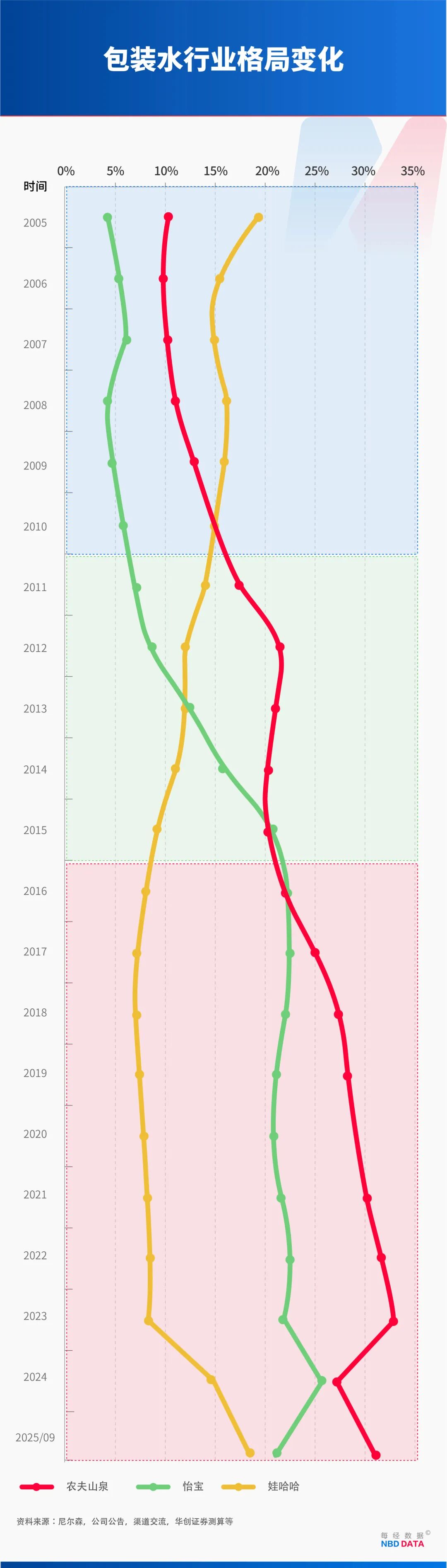 其实,包装饮用水的同质化竞争早已开局。激烈缠斗之下,行业“开山鼻祖”怡宝也有过一段辉煌经历,登顶全国包装饮用水市场冠军宝座。不过,在加剧的市场竞争下,农夫山泉后来居上,怡宝只能屈居“千年老二”的尴尬位置,且市场份额不断被瓜分。