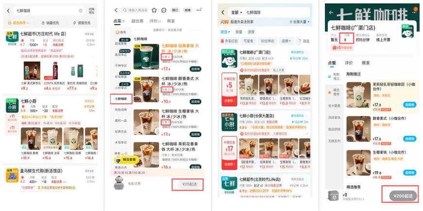 值得注意的是,定位于北京市的美团外卖上线门店中已经可以陆续看到七鲜咖啡的销量,不过七鲜咖啡是放在了七鲜小厨的附属栏内,且店内配送起送价格定在20元起,而淘宝闪购似乎处于测试阶段,未上线销量同时起送价格定在200元起送。