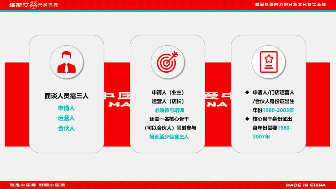 时代财经获得的塔斯汀最新加盟文件显示,目前,塔斯汀新加盟商在签署意向合同后,必须带三名人员与品牌方进行面谈。面谈人员包括申请人(业主)、运营人(店长)与合伙人,其中申请人与运营人必须参与公司培训。