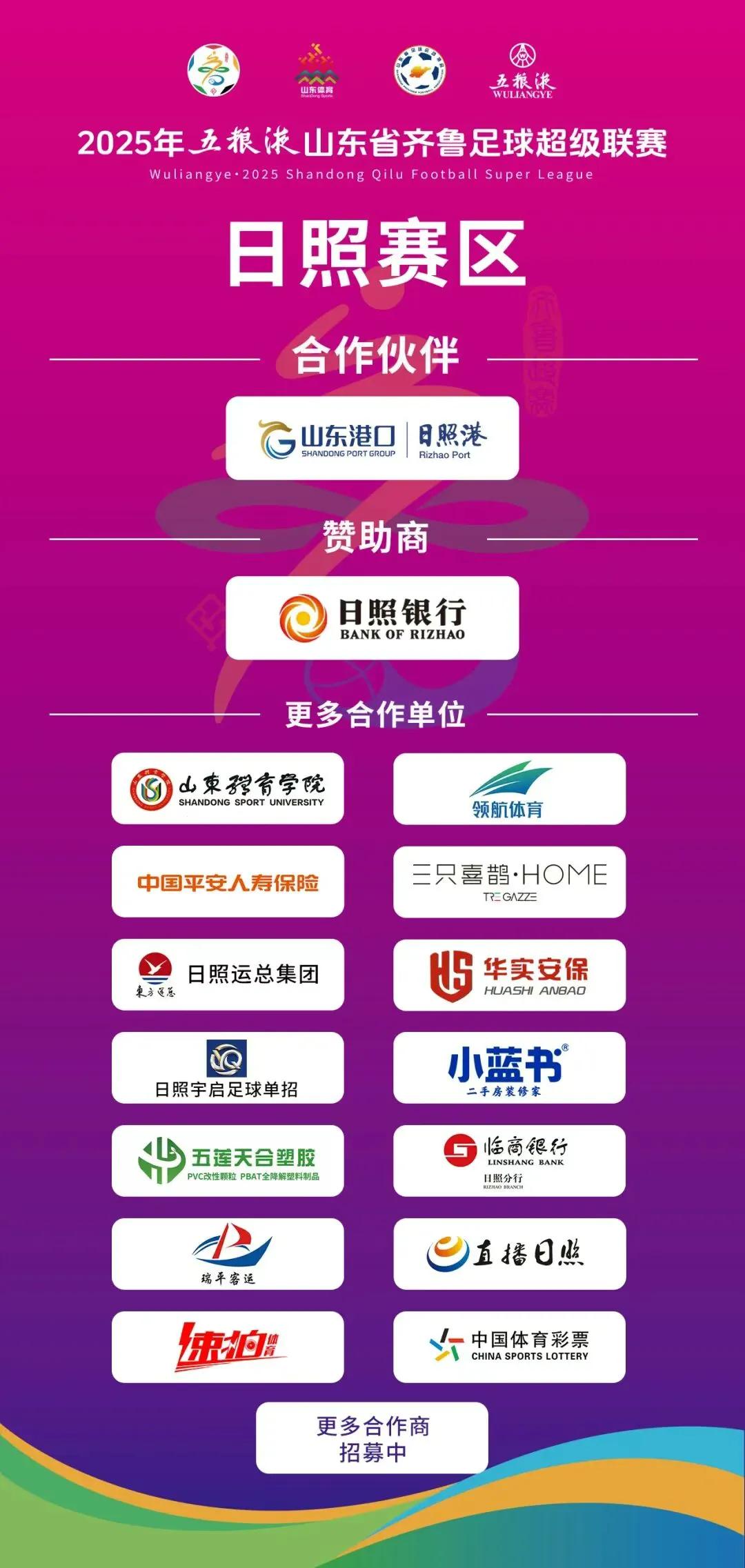 10月16日,公众号“日照市体育局”发布消息,继续就日照赛区进行招商工作。而在其中,山东港口日照港成为其合作伙伴;赞助商目前仅有1家,为日照银行。