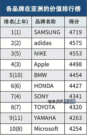 日经调查公司根据显示知名度等的“品牌号召力”和显示对购买等决策做出贡献的强度的“品牌贡献分析”,评估品牌价值并将其数值化。在亚洲,三星连续2年排在亚洲首位。日本品牌中汽车和电子相关品牌排名靠前……