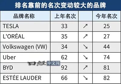 在前100名当中,中国的比亚迪(BYD)从2024年的第92位上升至第81位,美国特斯拉(TESLA)也从第33位上升至第25位。两家企业都通过主力纯电动汽车(EV)持续扩大市场,提高了品牌价值。另一方面,以汽油车为主的德国大众(VW)则从第34位降至第44位。