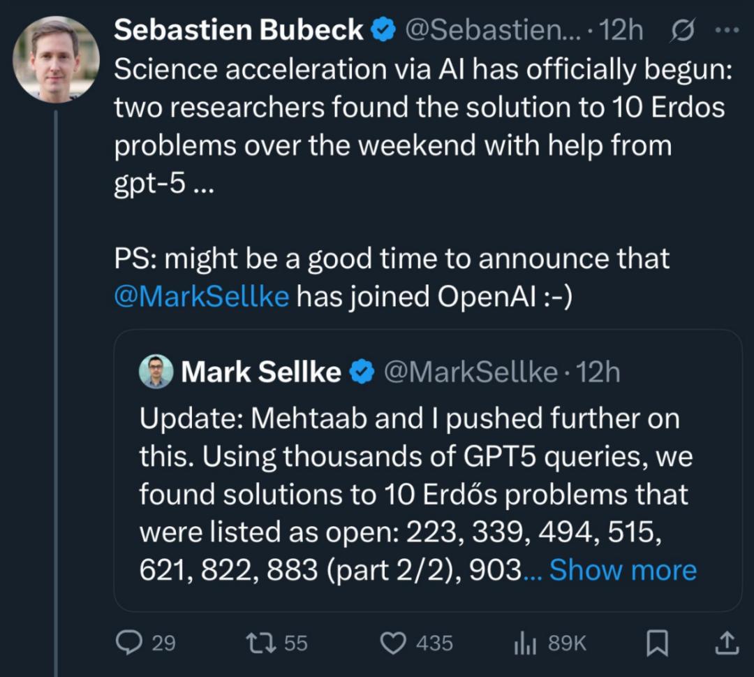 一句话概括就是:OpenAI 研究员宣称 GPT-5 「发现」了 10 个悬赏数学难题的解决方法,舆论误以为是 GPT-5 给出了解题方法,结果被发现只是检索到了早已存在的文献,引发了学界大佬的群嘲和对于 AI 夸大宣传的激烈讨论。