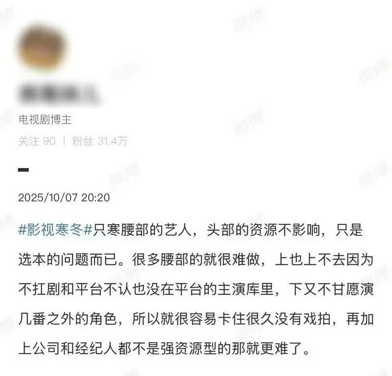 更糟的是,经纪公司体系的瓦解也让他们连“等活”的地方都没有了。非头部经纪公司几乎拿不到平台定制剧资源,中小公司失去了话语权,也失去了存在感。不少演员不得不选择解约、转签自由经纪人,或者干脆自己跑组。过去那种“公司为你谈项目、谈资源”的模式,也在慢慢消失。