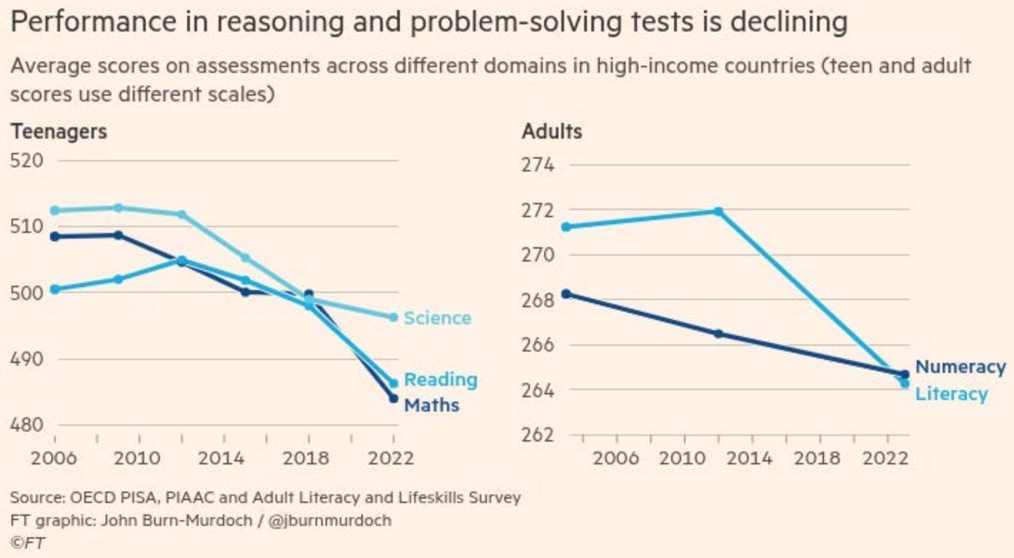 随着写作能力的下降,阅读能力的下降更为严重。化名希拉里乌斯·布克宾德(Hilarius Bookbinder)的大学教授在一篇关于大学校园状况的文章中写道:“不开玩笑,我们大多数的学生都属于功能性文盲。” 这一点也不夸张。几十年来,西方国家的读写和算术成绩首次出现下降,这让《金融时报》记者约翰·伯恩-默多克不禁思考,在为我们制造出思考机器的此刻,人类的“智力巅峰”是不是已经过去了。