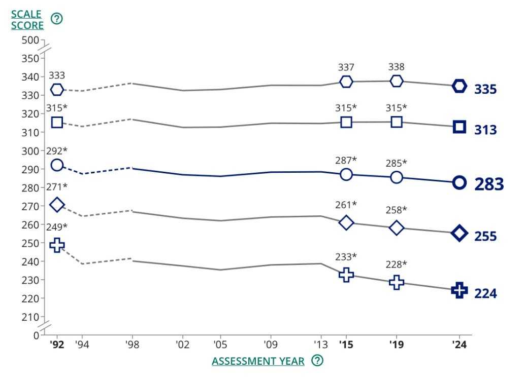 在美国,由NAEP(美国教育进展评估)发布的所谓“国家成绩单”最近发现,其平均阅读分数达到了32年来的最低点——这令人不安,因为这个数据也只能追溯到32年前。