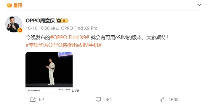 例如说前几天公布的 eSIM 手机 OPPO Find X9,其实也是采用实体卡 + eSIM 双模式的方案。