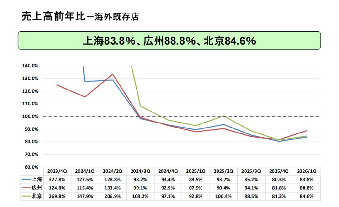 截至2025年财年(2025年8月31日),北上广三地既存门店的销售额分别下降18.7%、19.7%以及18.2%。从萨莉亚披露的2026财年预期数据来看,北上广地区门店的同店销售短期内没有明显回暖信号。
