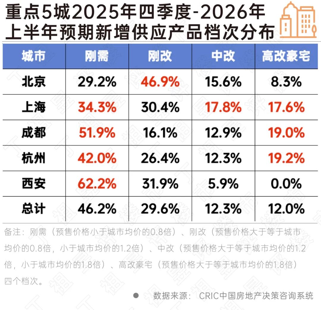 杭州刚改产品供不应求加剧,刚改产品为杭州2025年前8月成交主力,占比高达49.07%,而预期2025年四季度-2026年上半年新房供应占比仅为26.41%。刚需和高改豪宅产品或将存在供给过量。