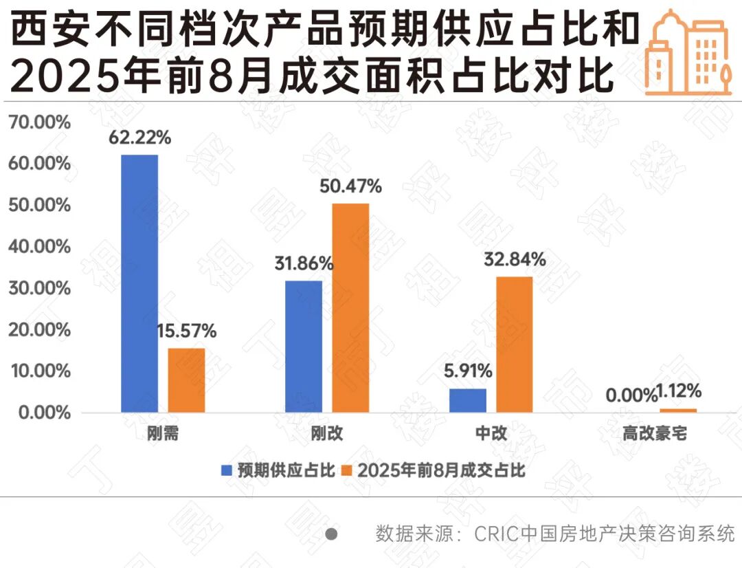西安刚需产品供给过量,刚需产品预期供应量占比高达62.22%,而2025年前8月成交占比仅为15.57%,而刚改、中改产品严重供给不足,供需错配较为显著。