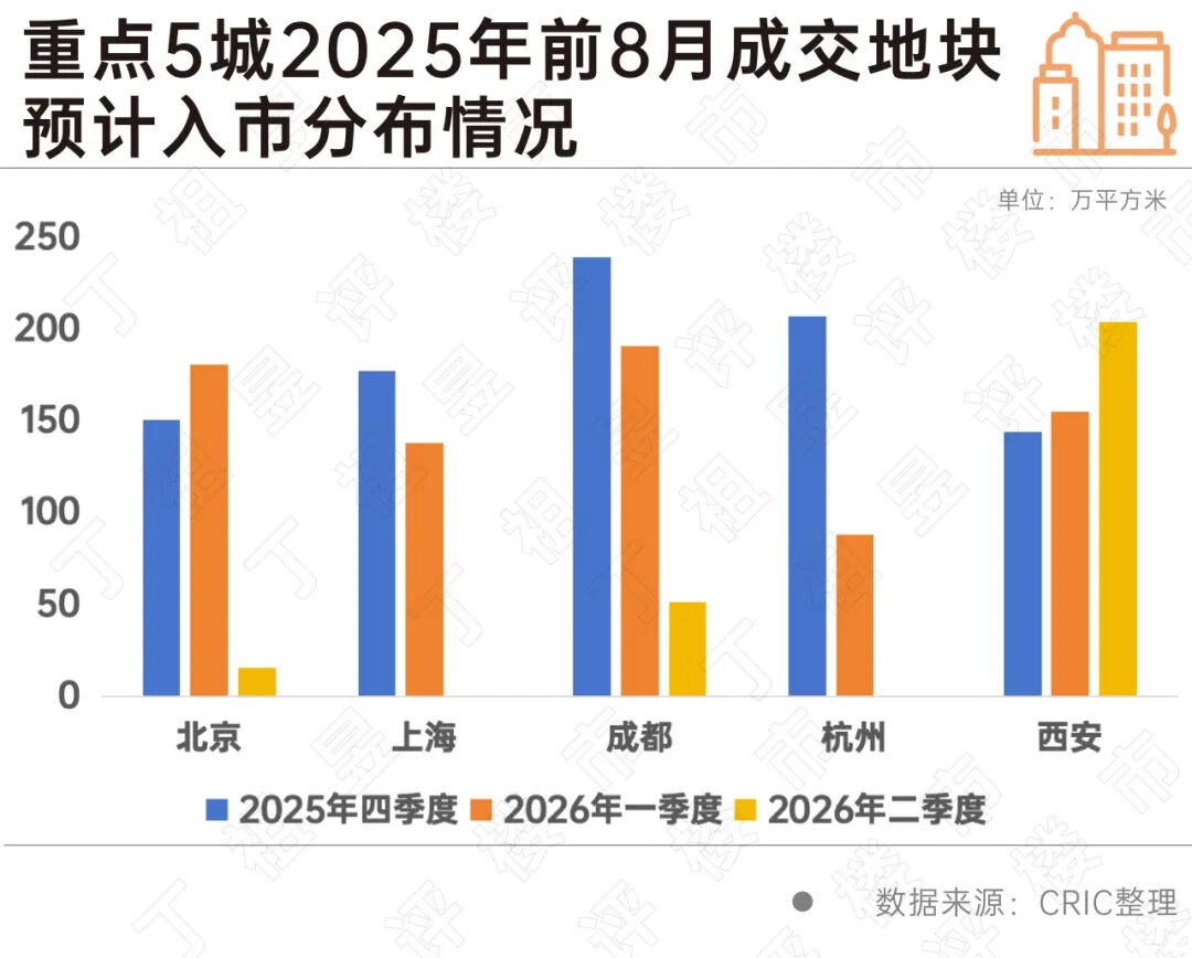 从前8月成交地块预期入市节奏来看,剔除已上市的部分地块,成都、杭州、上海2025年四季度仍是供应高峰,预期新增供应面积占比超50%,
