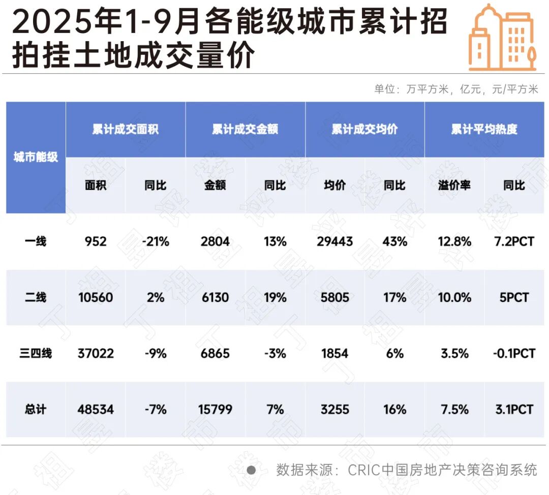 据CRIC监测数据,一线城市和二线城市2025年前9月成交金额、成交均价同比增幅均超10%,其中一线城市累计成交均价涨幅达到43%。一二线城市溢价率均在10%以上,较去年同期稳中有增。
