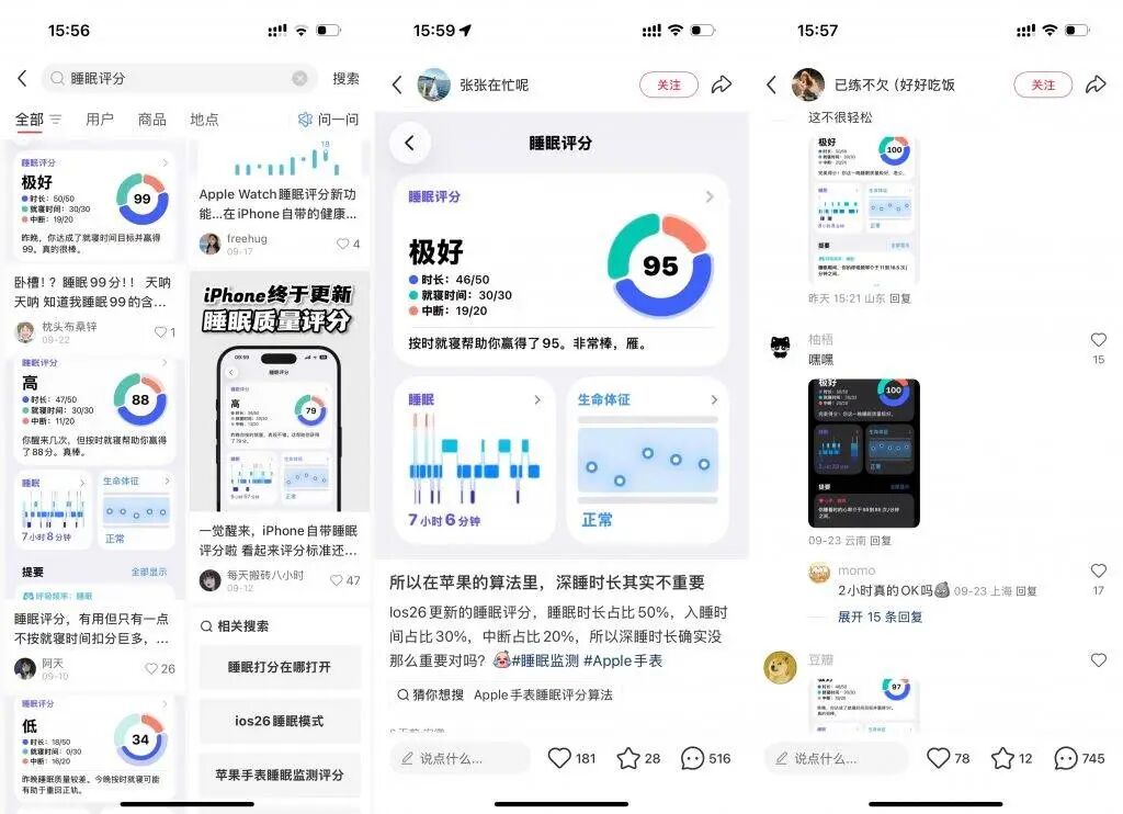 于是在小红书上,我们能看到不少非常类似的帖子:首图是一张睡眠评分的 iPhone 截图,点进去发现评论区也全被大家晒的睡眠评分截图淹没: