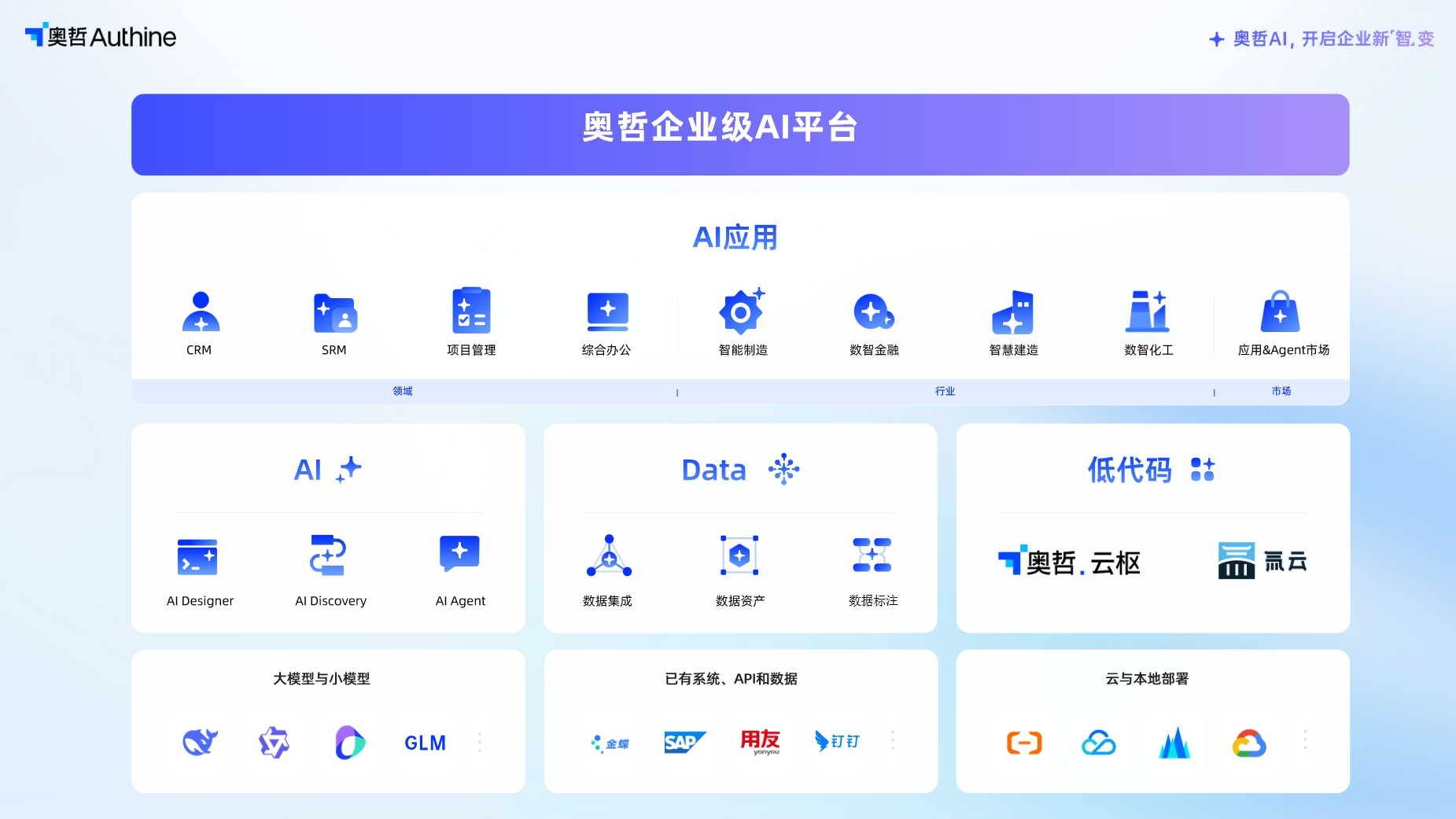 10月17日,以“奥哲AI,开启企业新「智」变”为主题的2025奥哲AI战略升级暨企业级AI平台发布会在北京成功举行。深圳奥哲网络科技有限公司(以下简称“奥哲”)在会上正式对外发布“奥哲企业级AI平台”,系统阐述了公司在AI时代的全新战略方向。该平台致力于通过“AI+Data+低代码”三大核心能力的深度整合,成为推动企业数智化转型的核心引擎,助力各类组织迈向AI原生新阶段。