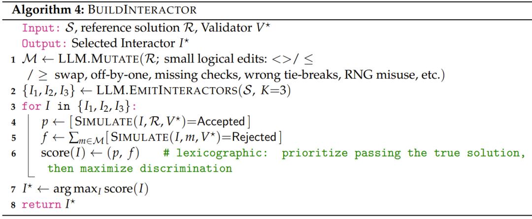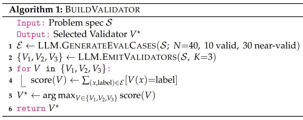 如图 1 所示,该框架始于验证器(Validator),它是整个系统的基石。其功能是确保任何给定的输入都严格遵守问题描述中指定的所有约束。一个验证器对于最小化漏报率(FNR)至关重要,因为它能防止正确的程序在格式错误的数据上失败。