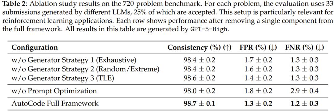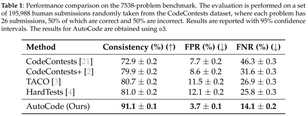 如表 2 所示,AutoCode 保持了其卓越的性能,实现了 98.7% 的一致性。这一结果验证了该团队的方法在现代、困难问题上的有效性,而先前的方法无法在这些问题上进行评估。