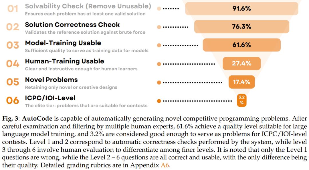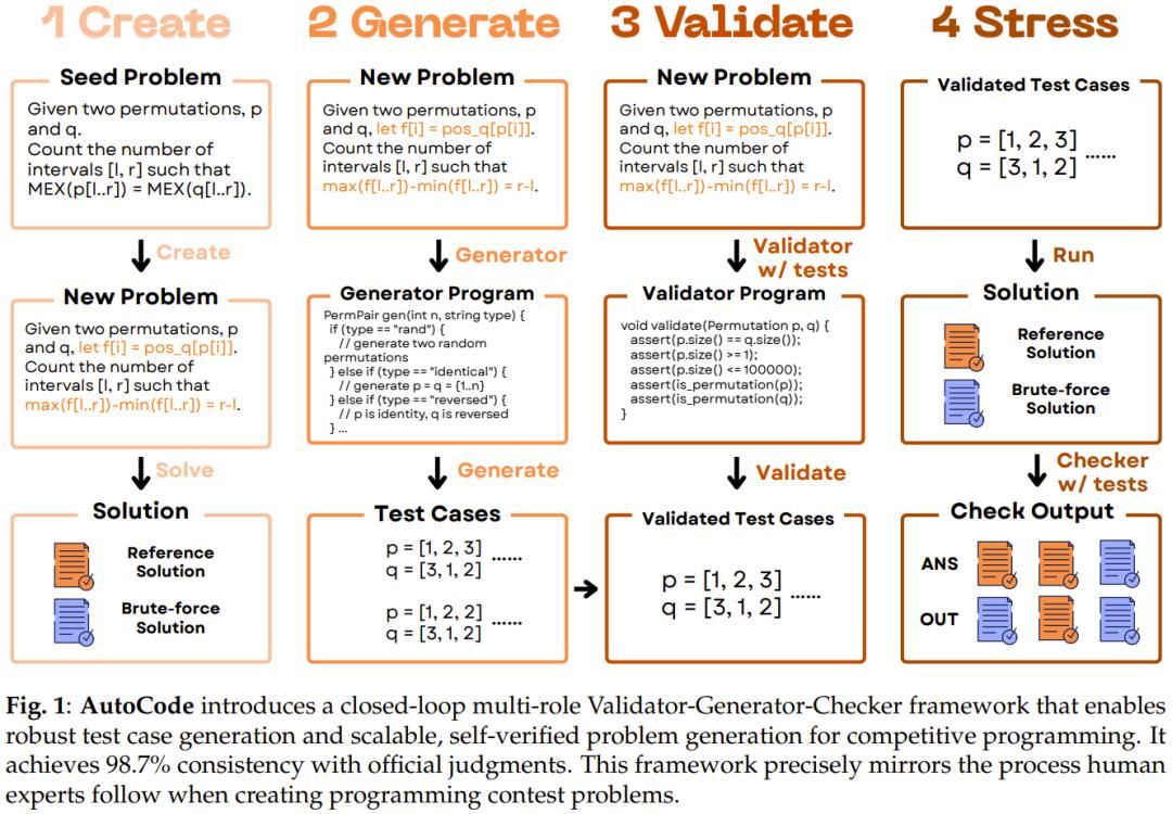 通过将验证器-生成器-检查器(及交互器)框架与双重验证协议相结合,AutoCode 在测试用例生成方面实现了最先进的可靠性,并超越了先前的方法,能够生成全新的、达到竞赛质量的问题。