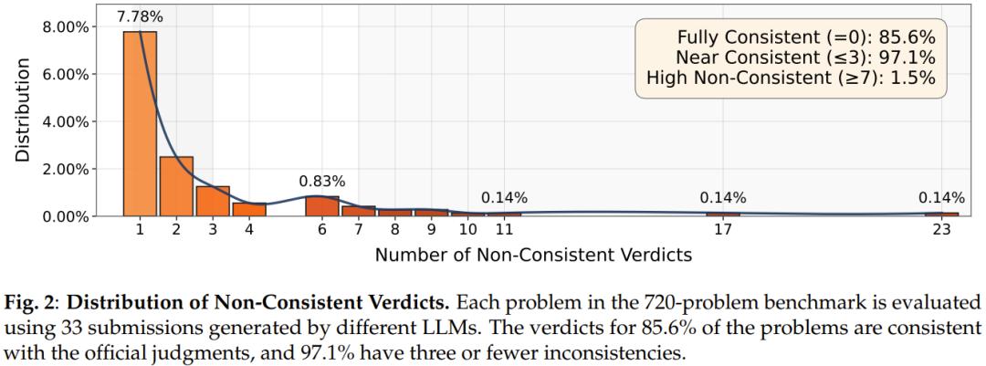这个双重验证协议(其中 brute.cpp 作为初始的地面真实,并且经过验证的参考解法还要再经过一个完整的测试生成周期)成功地过滤掉了 27% 的易错问题,将 LLM 提供的参考解法的正确率从 86% 提高到了 94%。