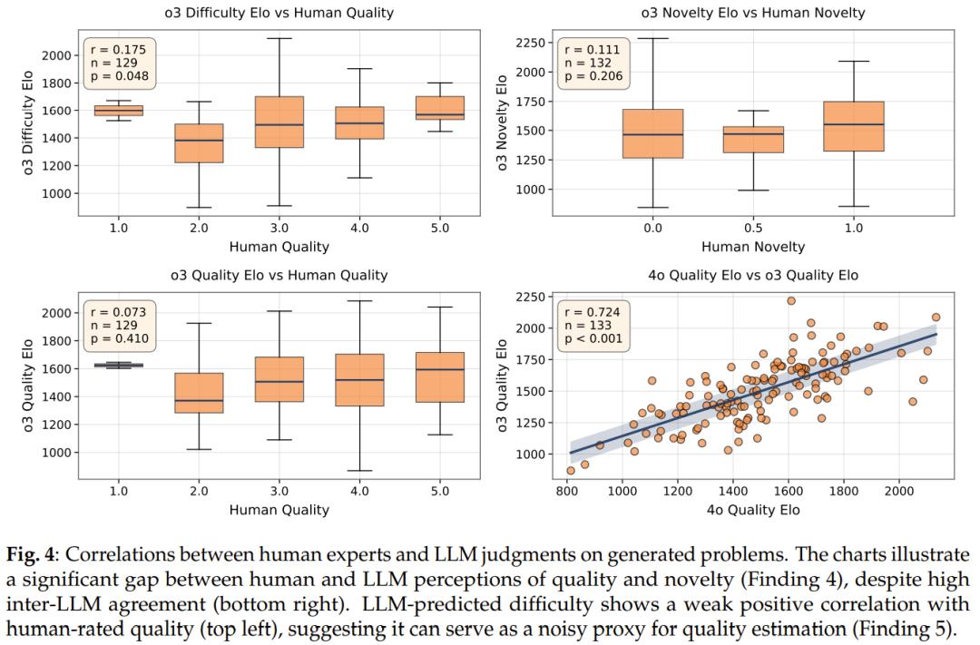 - 发现 4:人类专家和 LLM 在对问题质量和新颖性的判断上几乎没有相关性。