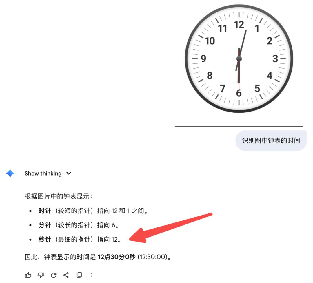 实测「看表」一直是AI的大难题,这里面涉及多种因素,钟表样式、指针长短、指向、分钟间隔的判断等等。
