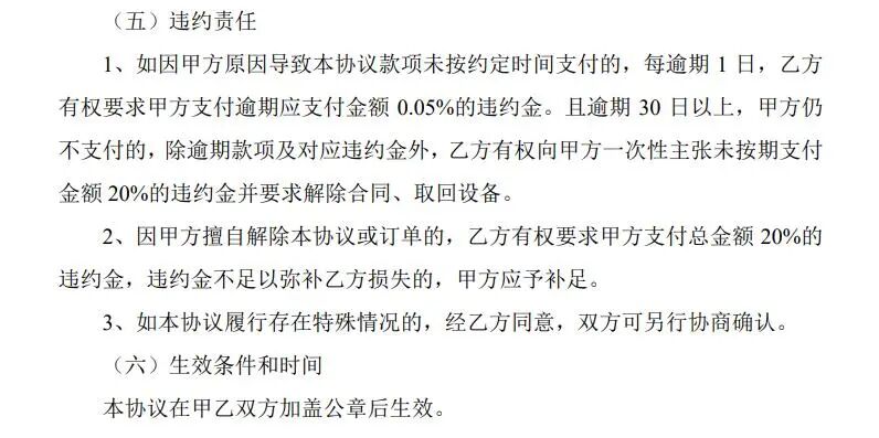 其二是,因甲方擅自解除本协议或订单的,乙方有权要求甲方支付总金额20%的违约金,违约金不足以弥补乙方损失的,甲方应予补足。