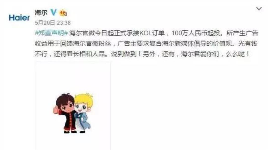 甚至,沈方俊还把海尔官方账号做出了营收,从2015年开始,海尔先后在公众号、微博开启广告位招租,VIVO、淘宝等等都先后投放合作。