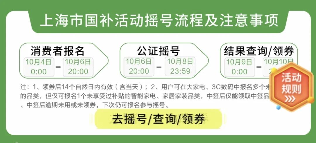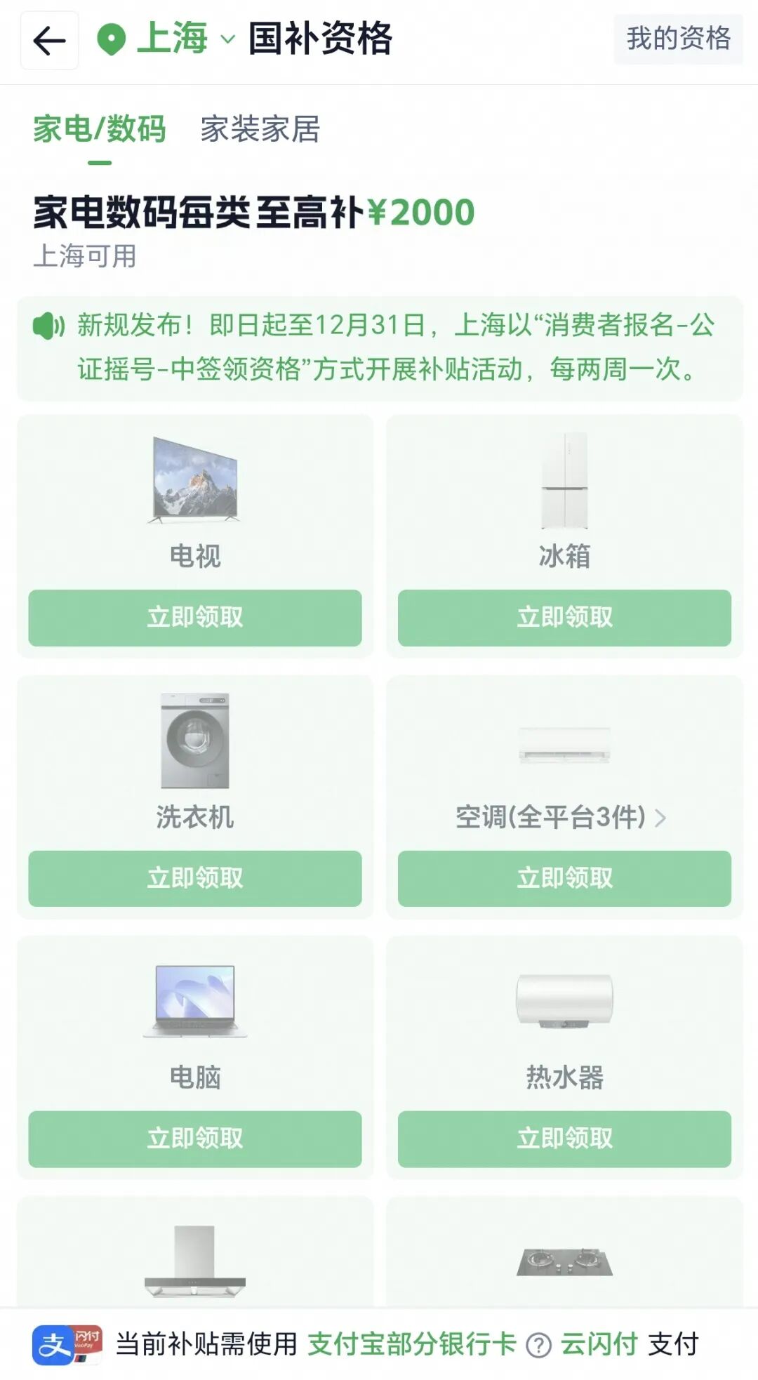 以上海为例,《IT时报》记者注意到,2025年9月20日至12月31日,上海按照“消费者报名、公证摇号、中签领取资格”的方式开展家电家居以旧换新补贴活动,每两周开展一轮报名。补贴资格需前往指定App云闪付领取,中签消费者可前往线下实体门店或线上平台使用。