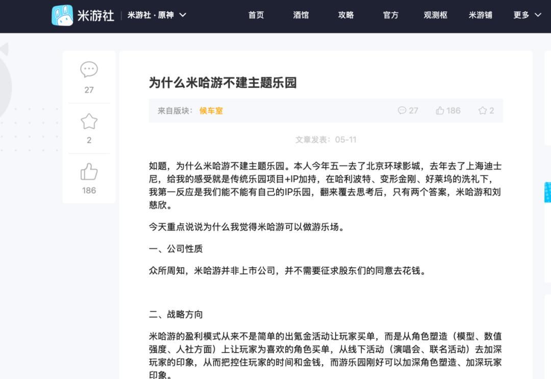 从现实角度出发,米哈游或许要重估主题乐园的战略意义。
