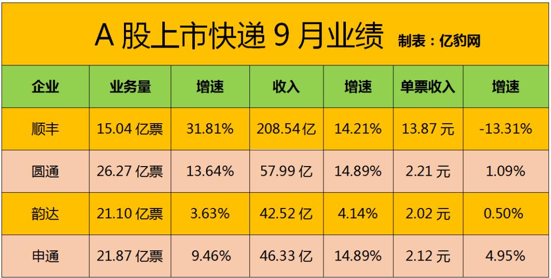 四家A股上市快递披露的9月业绩显示,圆通、韵达、申通三大快递单票收入集体增长,顺丰降幅环比收窄。