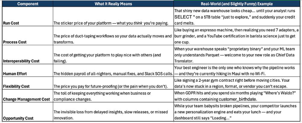 TCO =您为保持数据生态系统正常运行和有用而支付的一切费用(金钱、时间和白发)。
