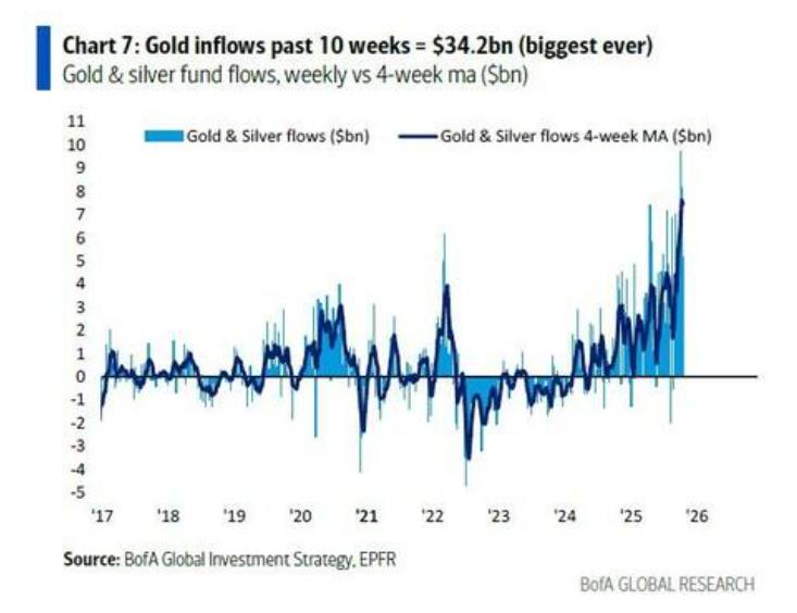 黄金市场同样火热,过去10周累计流入342亿美元,创下历史最高纪录。