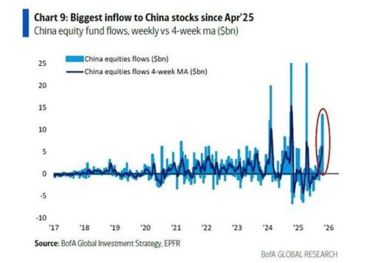 此外,中国股票市场也出现了自2025年4月以来最大的单周资金流入,达134亿美元。这种“买入一切”的势头,凸显了在降息预期下市场强烈的风险偏好。