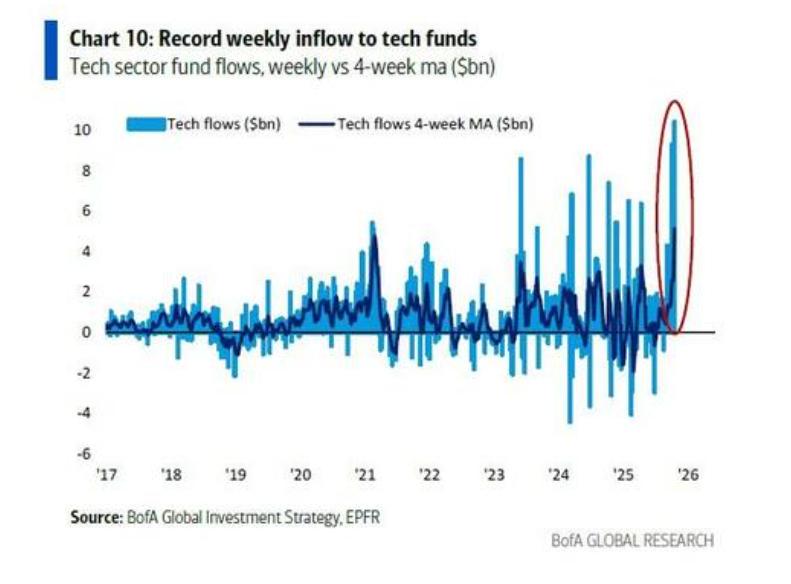 尽管Hartnett描绘了谨慎的前景,但最新的资金仍在以前所未有的势头涌入科技股与黄金等风险领域。