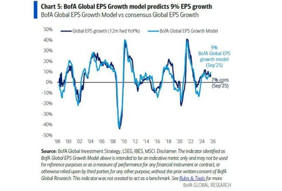 在国际市场方面,Hartnett继续看好国际股市,他预计恒生指数将升至33000点上方。美国银行的全球每股收益(EPS)增长模型预测,未来12个月全球EPS将增长9%,高于市场共识。