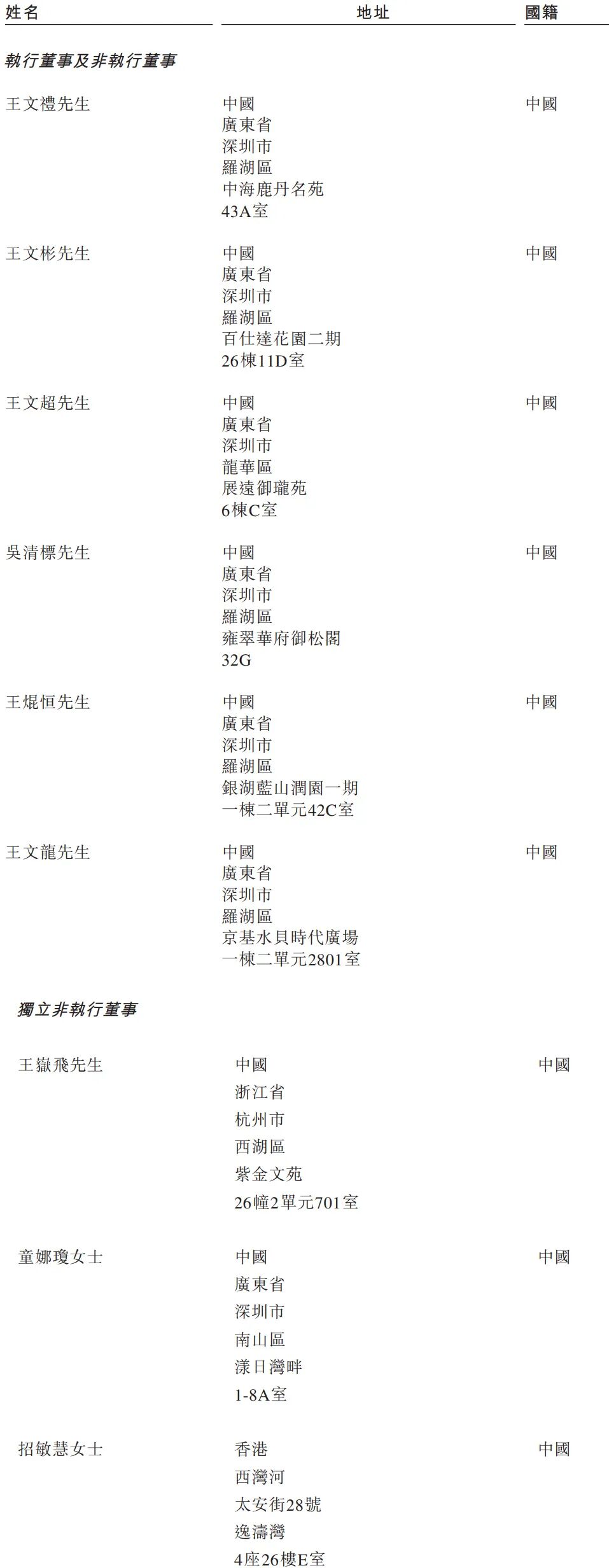 其中,王文彬、王文礼、陈雅静女士、吴小宁女士、王文超及王小萍女士为家族成员,王文彬、王文礼及王文超互为兄弟,陈雅静女士为王文彬的配偶,吴小宁女士为王文礼的配偶,王小萍女士为王文彬、王文礼及王文超的姊妹。蒋妮娜女士为王文超前妻。