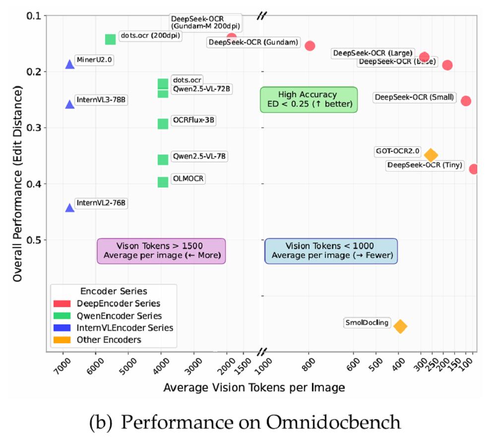从行业视角看,DeepSeek-OCR展示了另一种提高模型效率的可能路径——优化信息表达方式。通过视觉压缩减少token数量,模型可以在相同算力下处理更长的上下文内容。这一思路为未来在VLM视觉token优化、上下文压缩机制以及大模型遗忘机制等方向的研究提供了有价值的参考。