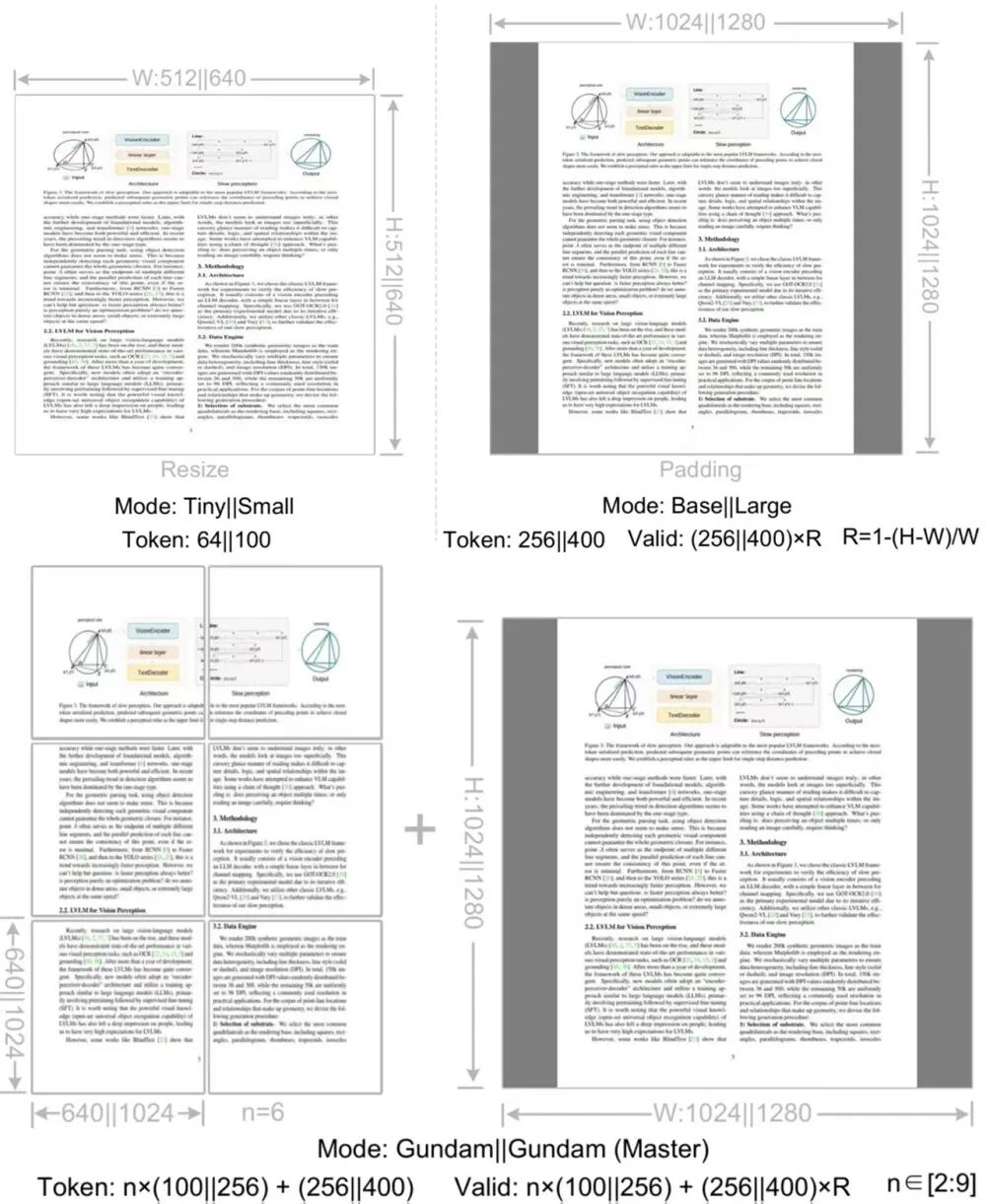 此外,它支持多种“分辨率模式”。从轻量的Tiny(64 token)到高保真的Gundam(795 token),模型可根据任务复杂度自动选择压缩等级。