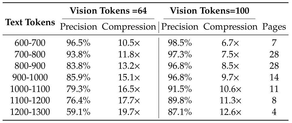 即便在近20×压缩时,模型仍能保持约60%的精度。这些结果充分说明,光学上下文压缩是一条前景广阔的研究方向,且无需额外计算开销,因为多模态系统本身已具备视觉编码器结构。