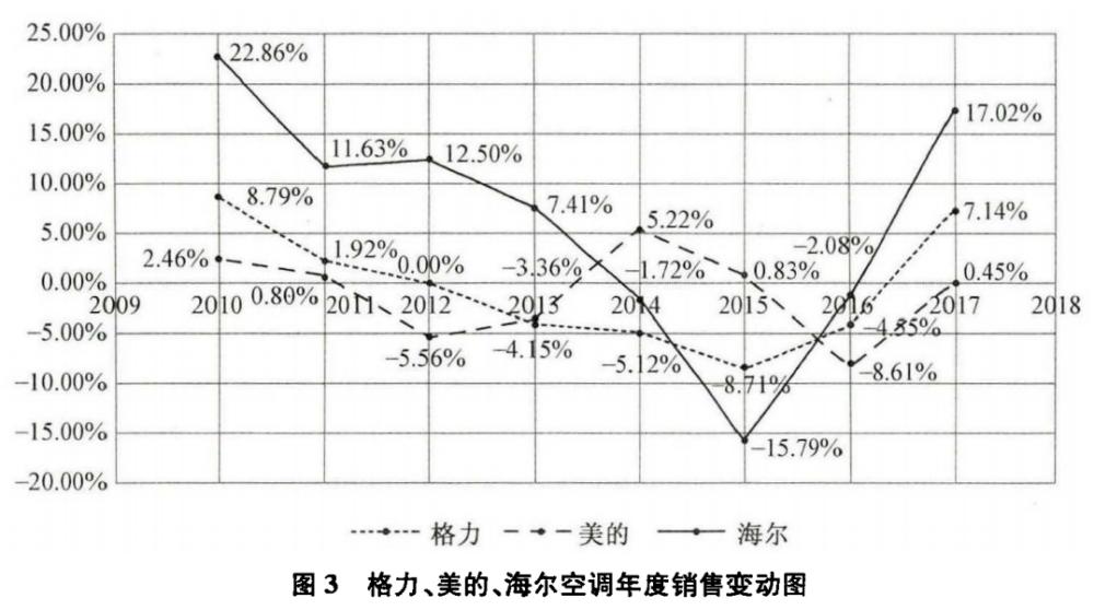有研究者对比了格力、海尔、美的三家在2009到2018年间,空调产品的年度销售额,并计算了销售增长变动率,以方便比较。