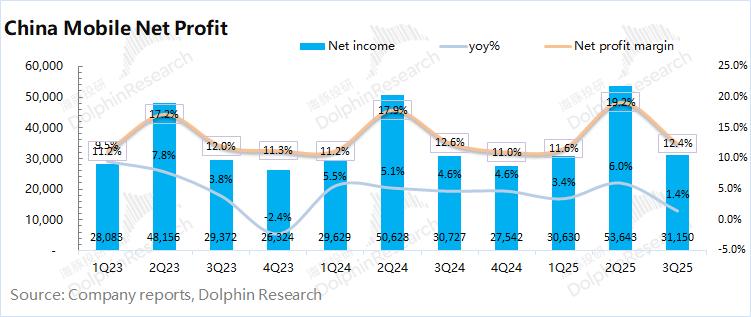 中国移动2025年第三季度净利润为312亿元,同比增长1.4%。其中公司本季度的销售费用和折旧&摊销费用都有所下滑,对利润有所增厚;