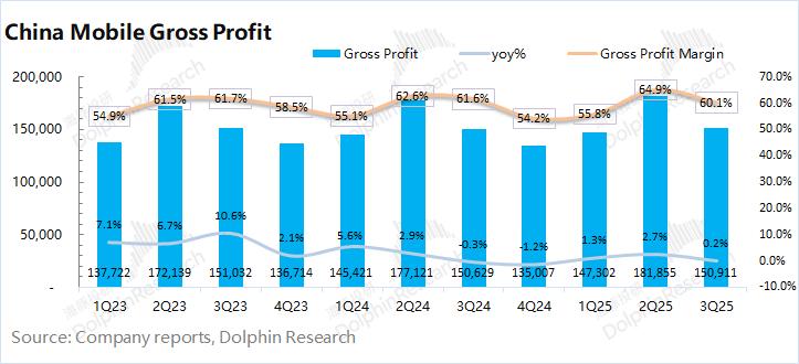 中国移动2025年第三季度毛利率60.1%,同比下降1.5pct。海豚君将“网络运营及支撑成本”和“销售产品成本”列为营业成本,进而测算公司毛利及毛利率情况。