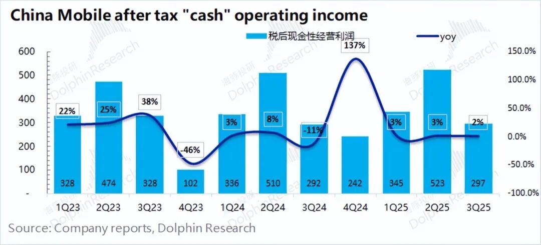 由于公司的折旧摊销高于资本开支,从现金流的角度看,公司本季度的税后现金性经营利润为297亿元(不考虑非经营因素影响),同比也有5亿元的提升。
