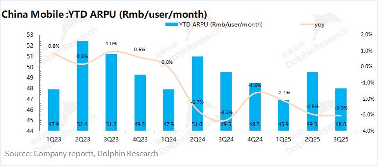 2)移动ARPU:公司本季度的单用户月资费为48元,同比下降3%。最近一年多以来,公司移动端的个人月均资费已经连续6个季度出现同比下滑,其中三季度公司又加大了“携号转网”等优惠力度。